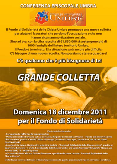 Per proseguire questa opera di solidarietà, che ha dato buoni risultati e sostenuto economicamente e moralmente tante persone che hanno visto cambiare la loro vita nel giro di pochi giorni, in tutte le chiese delle otto diocesi dell’Umbria domenica 18 dicembre 2011 si terrà una grande colletta durante le celebrazioni delle Sante Messe, il cui ricavato sarà destinato al “Fondo di solidarietà delle Chiese umbre”.